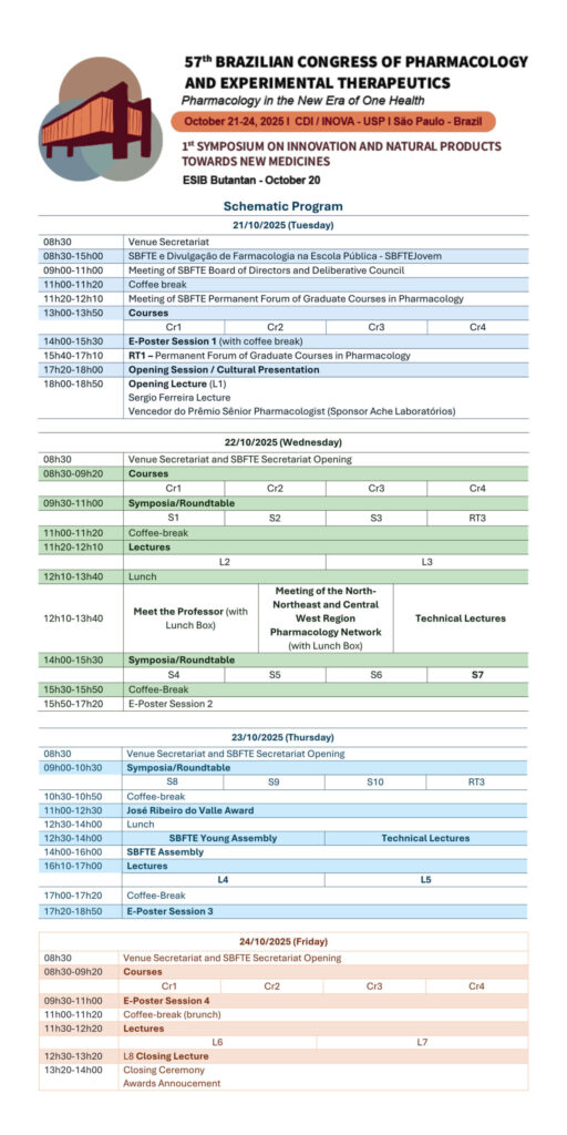 | 13h00-15h00 | Meeting of SBFTE Permanent Forum of Graduate Courses in Pharmacology |